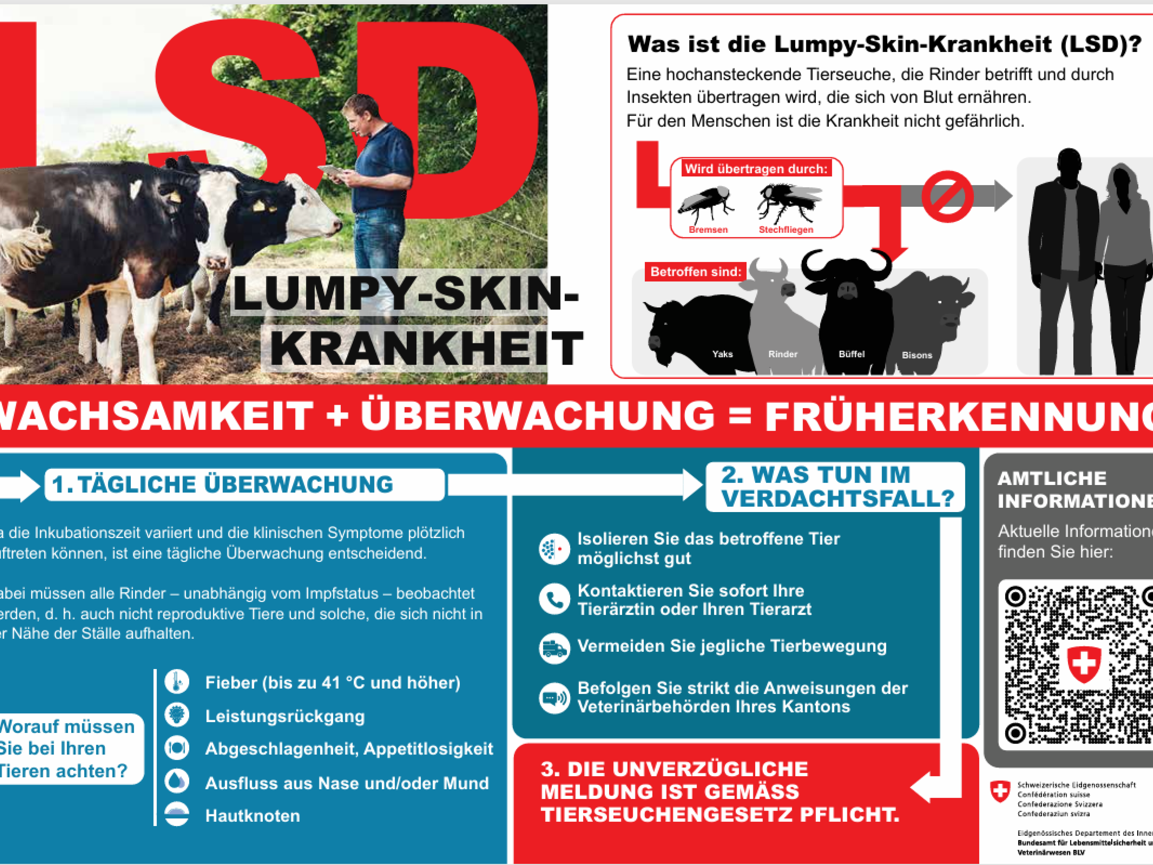 Lumpy-Skin-Krankheit (LSD) ist eine Viruserkrankung, die Rinder befällt und durch stechende Insekten übertragen wird. Sie kann sich innerhalb einer Herde rasch ausbreiten. Dieser vom BLV herausgegebene Flyer hilft Ihnen, die ersten Anzeichen zu erkennen. Wichtig ist, Ihre Tiere täglich zu beobachten und zu wissen, was bei Verdacht zu tun ist. Eine rasche Erkennung ermöglicht es, Ihre Tiere und den Schweizer Viehbestand wirksam zu schützen.