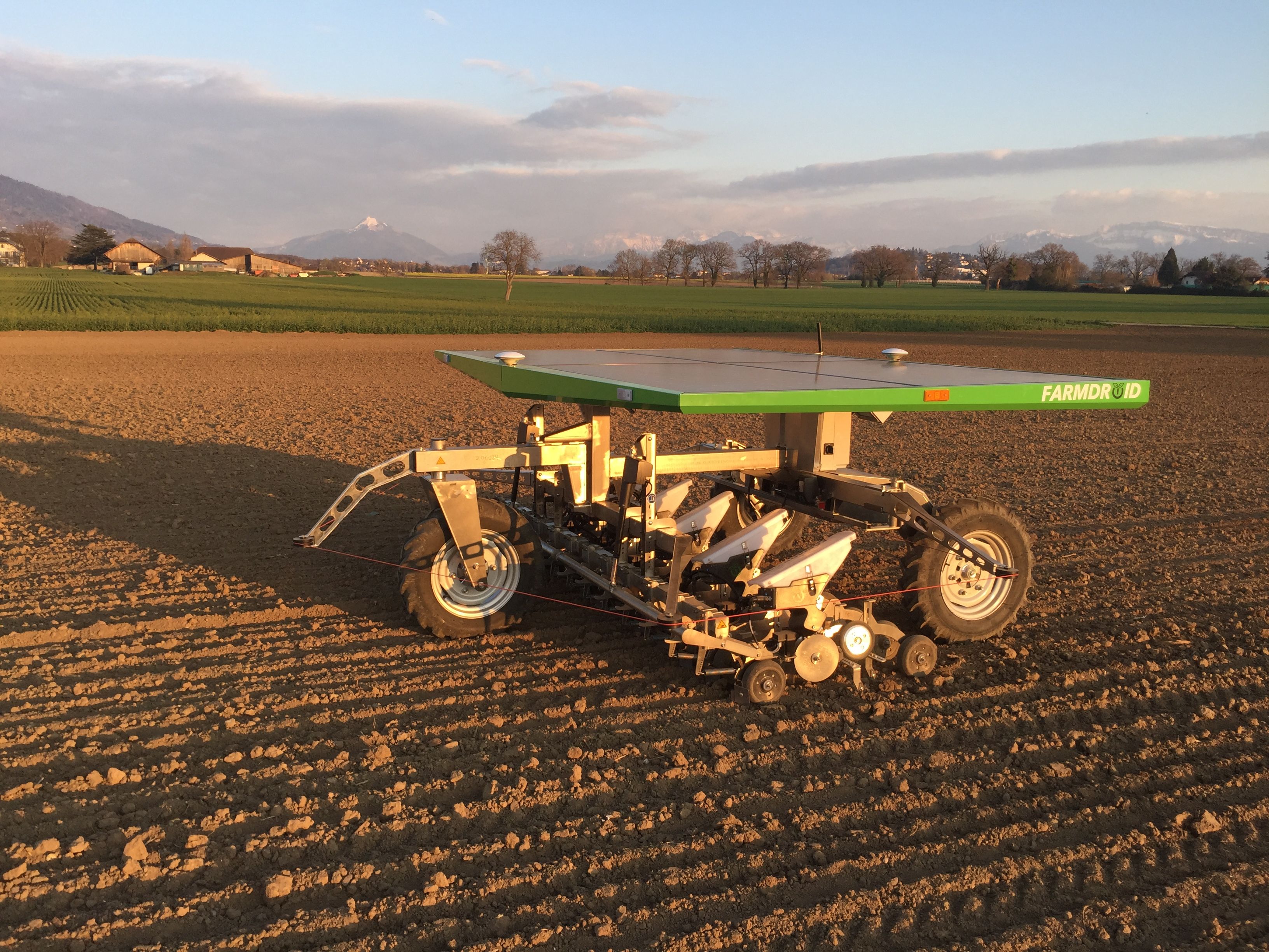 Farmdroid Roboter jätet und sät autonom Rüben in St-Aubin. © HAFL