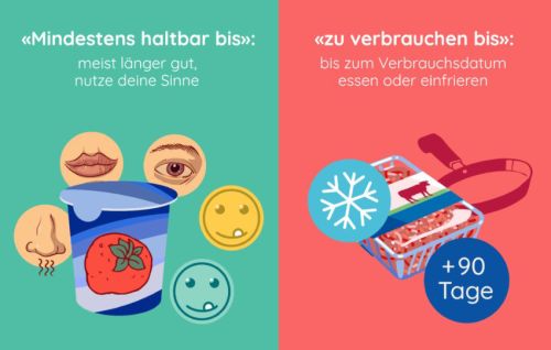 MHD (Mindesthaltbarkeitsdatum) und Verbrauchsdatum (VD) zu unterscheiden. Das MHD entspricht der Angabe „mindestens haltbar bis …“ auf trockenen Produkten, Konserven oder Getränken. Wenn das MHD überschritten ist, bleibt das Produkt ohne Gesundheitsrisiko geniessbar, sofern die Verpackung intakt ist und keine Veränderungen in Geruch, Geschmack oder Aussehen festzustellen sind. In der Regel kann sich die Konsumentin und der Konsument auf seine Sinne verlassen, denn Produkte mit Mindesthaltbarkeitsdatum zeigen deutliche Qualitätsverluste, wenn sie nicht mehr verzehrt werden sollten.Trotz fehlendem Gesundheitsrisiko können jedoch geschmackliche oder ernährungsbezogene Einbussen auftreten.