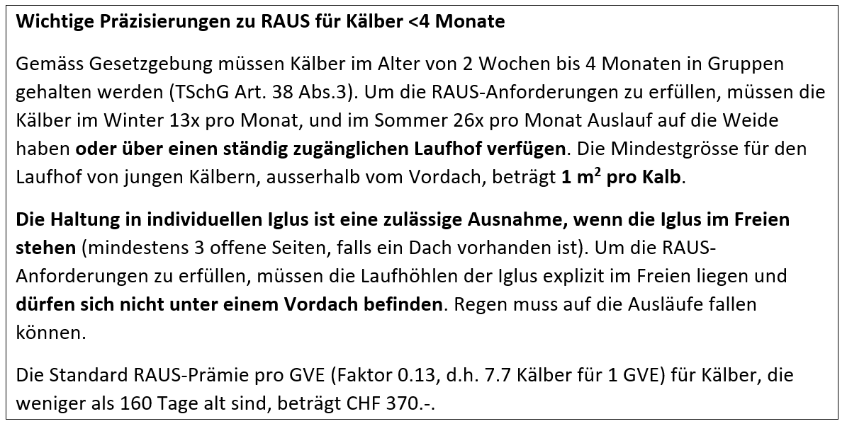- RAUS ist für alle Rinderkategorien, einschliesslich Kälber unter 4 Monaten, erforderlich.