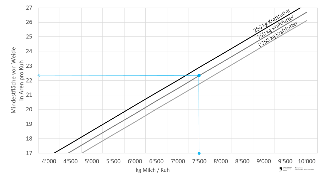 Die folgende Grafik zeigt den Mindestflächenbedarf für Milchkühe im Talgebiet, je nach Milchproduktion und Kraftfuttergabe.