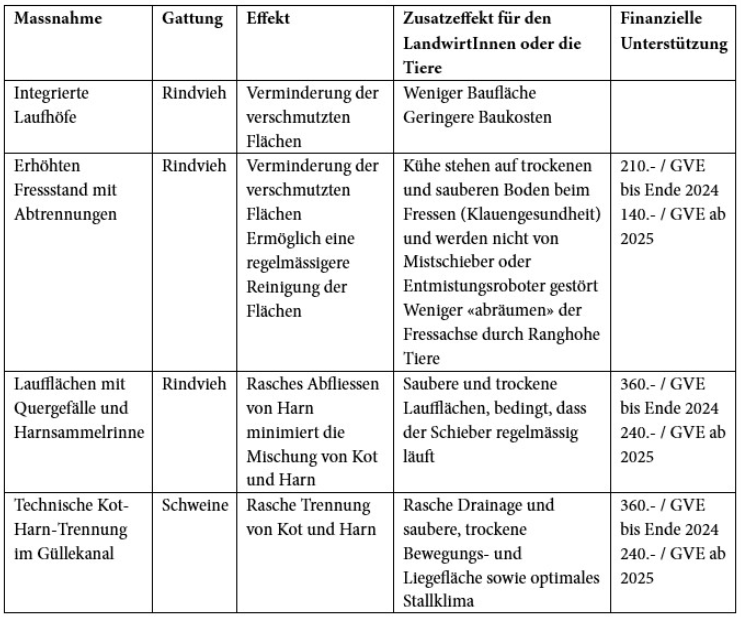 Ammoniakreduktionsmassnahmen sind aber vor allem bauliche Massnahmen, die dazu dienen die Ammoniakemissionen zu reduzieren. Diese bieten weitere Vorteile, insbesondere für die Gesundheit der Tiere, da ein hoher Ammoniakgehalt in einem Gebäude Atemwegserkrankungen verursachen kann. Einige Massnahmen werden von Bund und Kantonen finanziell unterstützt.