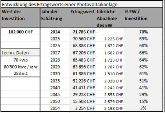 Dennoch nimmt die Leistung der Anlage jedes Jahr ab und die Abschreibung muss über einen Zeitraum von 30 Jahren erfolgen. Dies liegt daran, dass die Anlage altert und nicht auf die gleiche Weise wie ein Gebäude instandgehalten werden kann. Die Lebensdauer der Photovoltaikanlage kann nicht durch regelmässige Wartung oder Reparaturen verlängert werden. Daher muss die Anlage nach 30 Jahren entweder abgebaut oder ersetzt werden, was eine neue Investition verursacht. Nach 30 Jahren sollte die maximale Belastung auf null antizipiert werden.