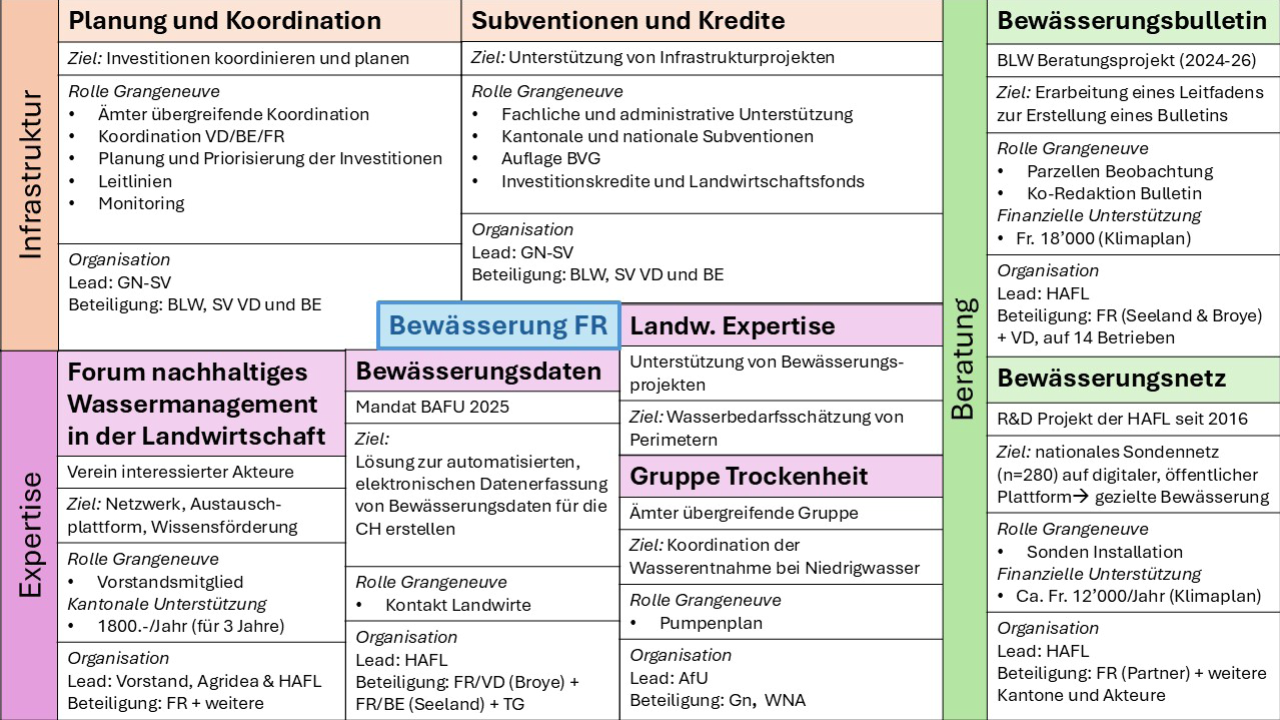 Grangeneuve unterstützt Sie durch Beratung sowie auch im Bereich Strukturverbesserungen in Bewässerungsprojekten und Wasserversorgungsprojekten im Sömmerungsgebiet. Die Tätigkeiten von Grangeneuve in Bezug auf Bewässerung sind in der folgenden Übersicht dargestellt. Sektor Strukturverbesserungen: Pascale Ribordy (Diese E-Mail-Adresse ist vor Spambots geschützt! Zur Anzeige muss JavaScript eingeschaltet sein!) Sektor Pflanzenbau: Tiziana Lottaz (Diese E-Mail-Adresse ist vor Spambots geschützt! Zur Anzeige muss JavaScript eingeschaltet sein!), André Chassot (Diese E-Mail-Adresse ist vor Spambots geschützt! Zur Anzeige muss JavaScript eingeschaltet sein!)