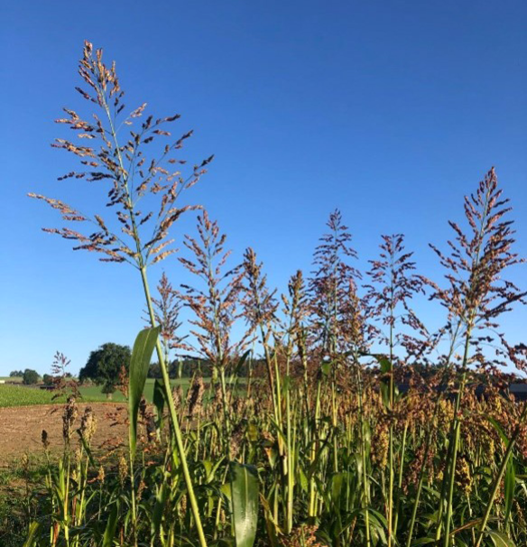 Getreidesorghum (Sorte RGT Vegga) mit grossen Rispen im Getreide.