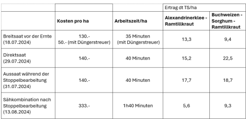 Es wurden vier verschiedene Anbaumethoden verglichen: Aussaat vor der Ernte, Direktsaat in Stoppeln, Aussaat während der Stoppelbearbeitung und „traditionelle“ Aussaat mit einer Sähkombination nach einer ersten Stoppelbearbeitung. Die Aussaat vor der Ernte schien hinsichtlich des Zeitaufwands vielversprechend, lieferte auf der Demofläche jedoch keine zufriedenstellenden Ergebnisse. Die Bodenbedeckung war sehr unregelmässig und das Unkraut konnte sich stark entwickeln.