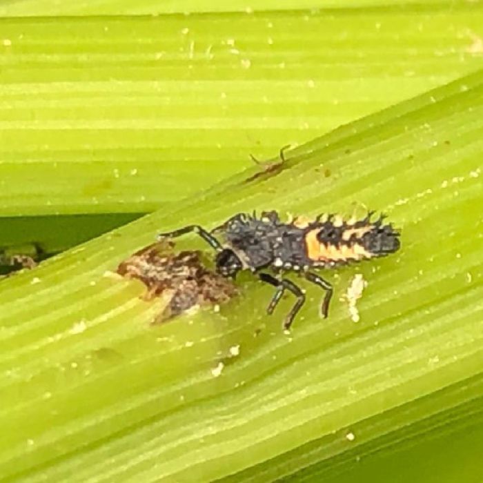 Auf einigen Parzellen ist die Anzahl der Einstiche durch die Eiablage mit bis zu 200 Einstichen pro Pflanze enorm. Die Auswirkungen dieser Einstiche auf den Zuckerertrag sind jedoch zu relativieren. Zum einen, weil 70 % der Eier nicht schlüpfen: Sie werden von natürlichen Feinden (z. B. von Marienkäferlarven, siehe Foto) gefressen. Andererseits fressen die Larven bei kräftiger Blattmasse „nur” im Blattstiel und beenden ihren Lebenszyklus in diesem, ohne sich bis in den Rübenkopf hineinzufressen. Wenn die Pflanze jedoch unter starkem Wasserstress steht, z.B. auf Parzellen mit flachgründigen Böden, ist im Herbst mit Fäulnisschäden zu rechnen, wenn die Frassgänge im Rübenkopf von Bakterien oder dem Pilz Rhizopus befallen sind. Gemäss Schätzungen geht man bei Frassgängen der Larven in den Blattstielen und in den Rübenköpfen ohne Fäulnis von Ertragsverlusten von 5 bis 7 % aus.