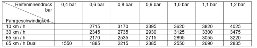 Auf den Reifen finden sich zwei Indizes, welche die Geschwindigkeit und die maximale Radlast definieren und denen sie standhalten können. Darüber hinaus veröffentlichen Hersteller Tabellen, mit denen der optimale Druck für ein bestimmtes Gewicht und eine bestimmte Geschwindigkeit zu finden sind. Diese Tabellen sind oft über kostenlose Smartphone-Apps verfügbar. Mögliche Reifenbelastung in kg je nach Reifeninnendruck und Fahrgeschwindigkeit.