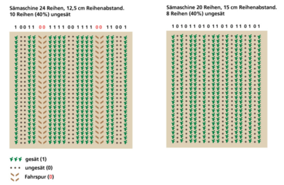 Die weiten Reihen dieser Massnahme fördern Hasen, Feldlerchen oder die Ackerbegleitflora. Sie kann für alle Winter- und Sommergetreide mit Ausnahme von Mais umgesetzt werden. 40 % der Schare müssen bei der Aussaat geschlossen sein. In den nicht besäten Teilen muss der Reihenabstand mindestens 30 cm betragen. Die Quersaaten können angemeldet werden, sofern sie die Bedingungen erfüllen.