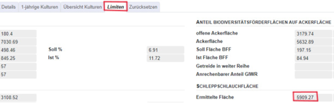 Ein weiterer Stolperstein auf der Wanderung ist das Schleppschlauchobligatorium auf Flächen mit einer Hangneigung von weniger als 18 %. Für Ihren Betrieb finden Sie die entsprechende Fläche in GELAN > Kulturen/BFF 1 > Limiten.