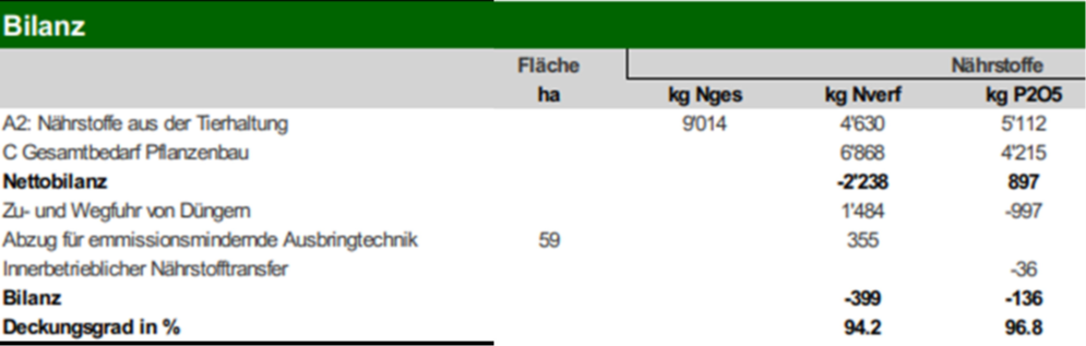 Im Beispiel beträgt die Fläche 5’909 Aren, also 59 Hektaren. Diese Fläche muss in der Nährstoffbilanz erfasst werden, in der Kategorie «Abzug für emissionsreduzierte Ausbringverfahren».
