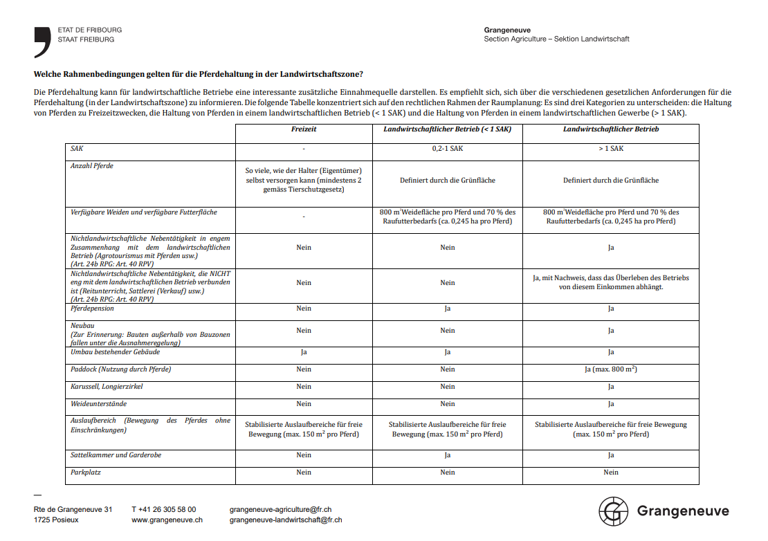 Bei landwirtschaftlichen Betrieben un landwirtschaftlichen Gewerben wird die maximale Anzahl der Pferde, die gehalten werden dürfen, über die Grünlandfläche bestimmt. Und die Haltung von Pensionspferden ist erlaubt. Nur landwirtschaftliche Gewerbe dürfen einen Paddock (max. 800 m2) für den Reitsport bauen.