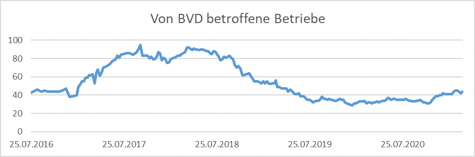 Dank den Bemühungen der Landwirte und ihrer Tierärzte ist das Auftreten der Krankheit seit dem Höchststand von 2017-2018 zurückgegangen. Allerdings wurde in den letzten Monaten wieder ein Anstieg der Fälle beobachtet. Dies zeigt, dass weiterhin die Notwendigkeit besteht, aufmerksam zu sein und die Hygienemassnahmen zu beachten.