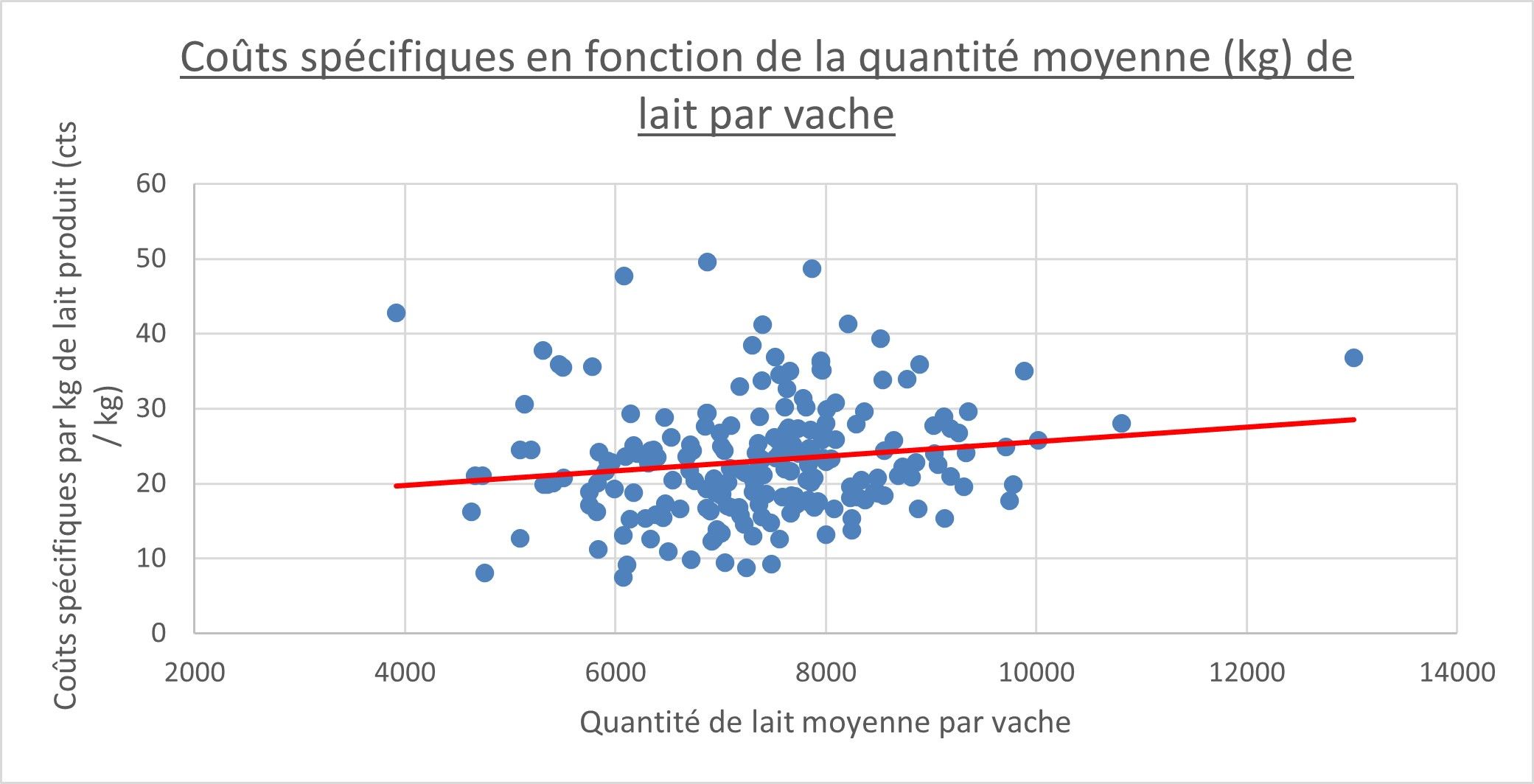 Il est toutefois très difficile de dégager des tendances et aucune économie d’échelle selon la quantité de lait produite n’a pu être observée. La taille de l’exploitation n’a également que peu d’influence sur les résultats, tout comme la zone de production. Le graphique ci-dessous montre une tendance à des coûts spécifiques très légèrement à la hausse pour les exploitations ayant une production laitière plus intensive. Il convient toutefois de relativiser ce résultat car les différences ne sont que très minimes.