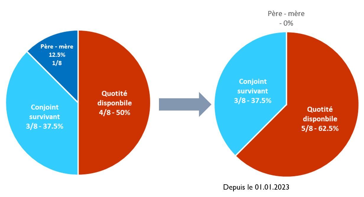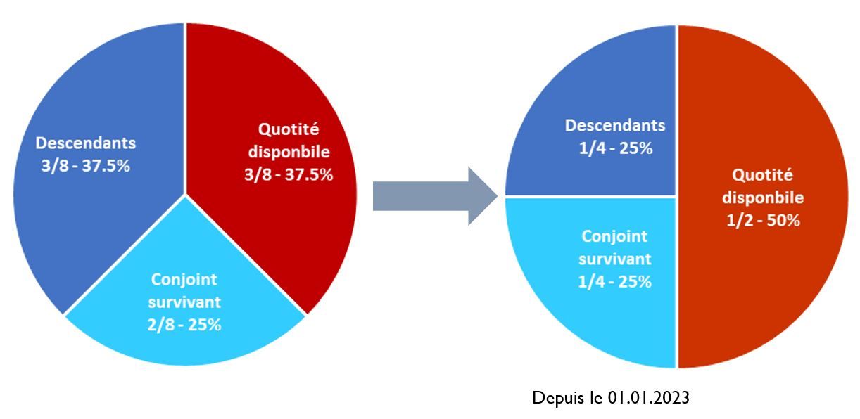 Le futur défunt ne peut pas enlever la totalité de la succession à ses héritiers. Il est tenu de transmettre les réserves à ses héritiers réservataires. La partie restante est appelée la quotité disponible et peut être attribuée librement. En modifiant les réserves, cette réforme offre la possibilité d’augmenter la quotité disponible pour les héritiers. Les graphiques suivants, illustrent l’augmentation de la liberté testamentaire du futur défunt.