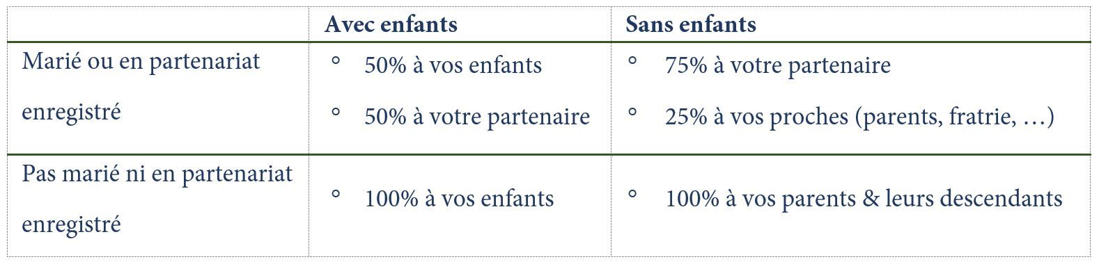 Dans le cas où il n’y a pas de testament ou de pacte successoral, la révision du droit des successions ne modifie pas la répartition. La succession est divisée entre les héritiers légaux selon le régime légal. La répartition s’effectue selon les parts légales déterminées dans le code civil suisse dans l’ordre préétabli.
