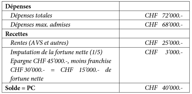 Ce calcul part donc du principe que la fortune pourrait être consommée à raison de 20 % par an pour contribuer aux frais. La fortune nette prise en compte dans le calcul admet une franchise de CHF 30’000.- pour une personne seule pour le calcul du droit aux PC et de CHF 200’000.- pour le calcul du droit aux PFA.