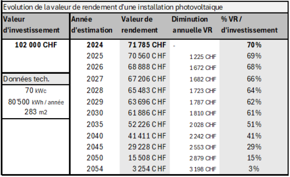 Le tableau ci-dessous présente la réduction de la valeur de rendement* liée à une installation photovoltaïque au fil des ans. Ici, un investissement d’une valeur de CHF 102’000.- permettant de produire 80’500 kilowattheures la première année.