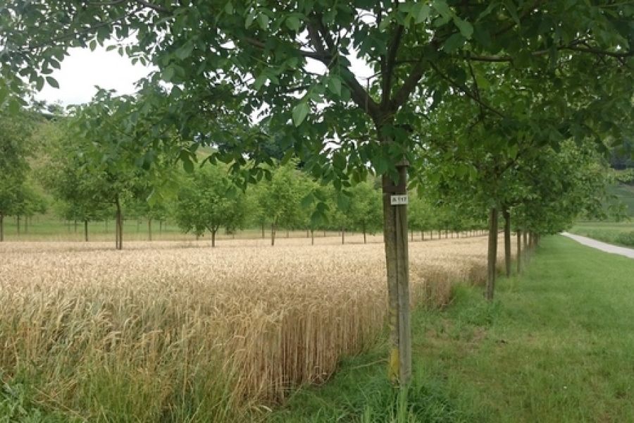 Allées de noyers intercalés entre une culture de céréales.