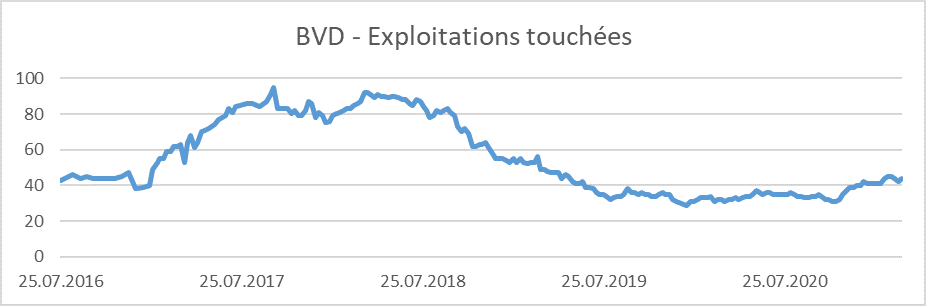 Grâce aux efforts des agriculteurs et de leurs vétérinaires, la présence de la maladie a globalement diminué depuis le pic de 2017-2018. Toutefois, une augmentation des cas est à nouveau observée ces derniers mois ce qui démontre la nécessité de rester toujours très attentif aux mesures sanitaires.