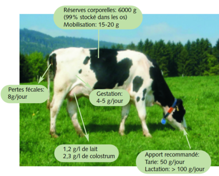 contient environ 56 l de sang, 0.1g de calcium est contenu dans chaque litre de sang ce qui représente 5.6g de calcium disponible au total. Pour produire 1l de colostrum, la vache excrète 2.3g de calcium. Cela signifie qu’une vache peut produire seulement 2.5l de colostrum et ses réserves en calcium dans le sang sont épuisées ! La vache va donc puiser du calcium dans ses réserves osseuses, réserves qui se reconstitueront d’ici le prochain vêlage (Figure 1).
