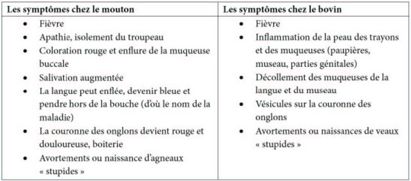 Cette maladie infecte les ruminants domestiques. Les moutons présentent des symptômes marqués. Chez les bovins, les symptômes sont plus rares alors que les chèvre sont en général asymptomatiques.