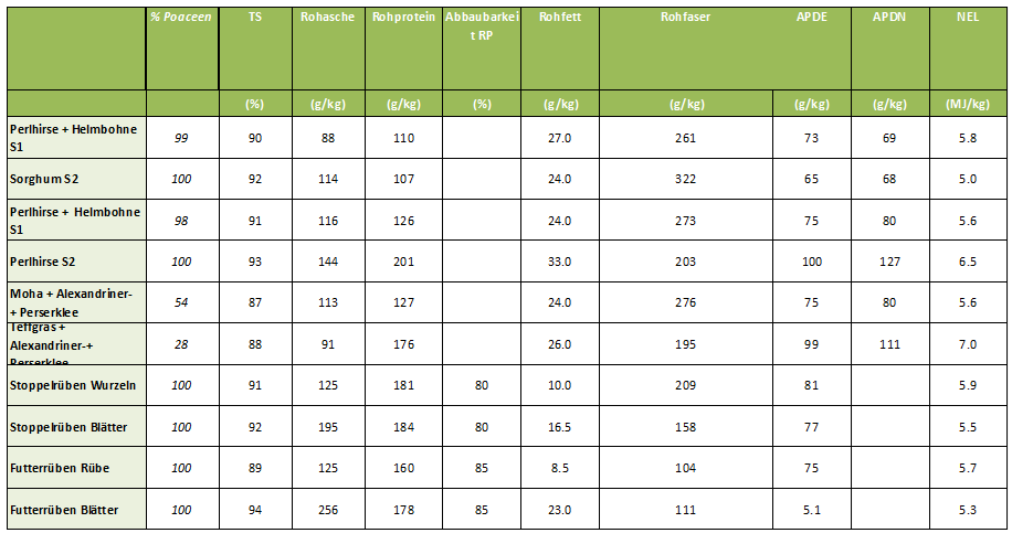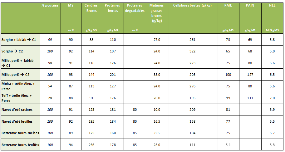 Les analyses n’ont pas été simples à interpréter, car il n’existe pas de régressions précises pour chacune de ces espèces. De façon générale, les valeurs ont été plutôt inférieures à celles attendues. La valeur du teff est élevée, mais en réalité c’est la très forte proportion de trèfle d’Alexandrie qui a positivement influencé ce résultat.