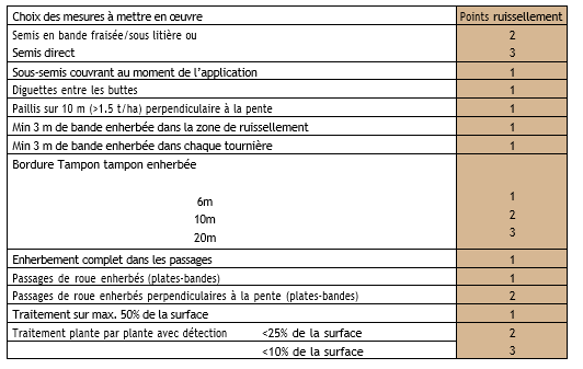 Selon les PER, au moins 1 point de réduction du ruissellement doit être atteint sur toutes les parcelles traitées avec des produits phytosanitaires présentant une pente de plus de 2 % en direction d'une route ou d'un chemin drainé.